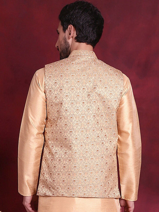 Men’s Gold Woven Design Nehru Jacket with Pocket Square