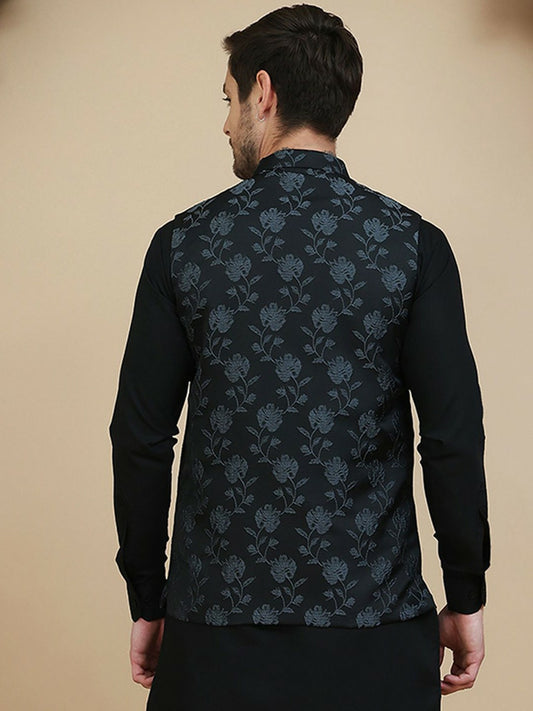 Black Floral-Embossed Cotton Linen Nehru Jacket for Men | indiaista
