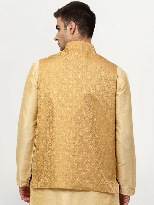Men’s Gold Woven Nehru Jacket – Silk Blend Festive Sleeveless Vest