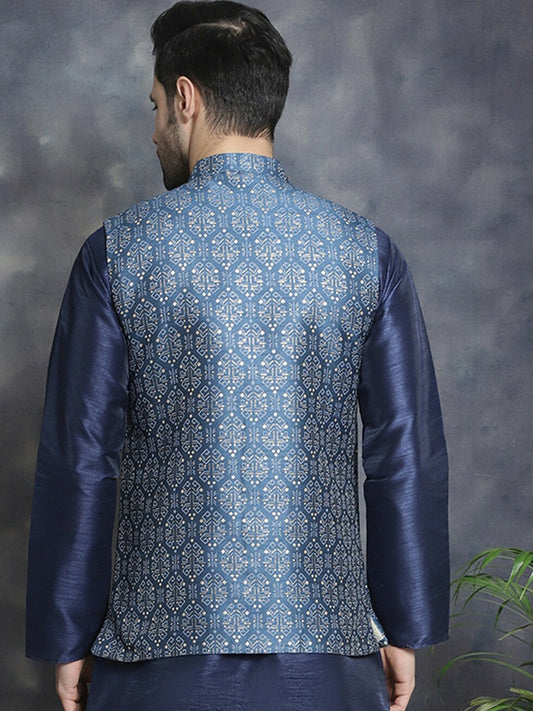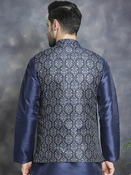 Men’s Navy Blue Ethnic Printed Nehru Jacket