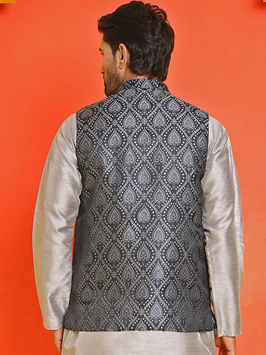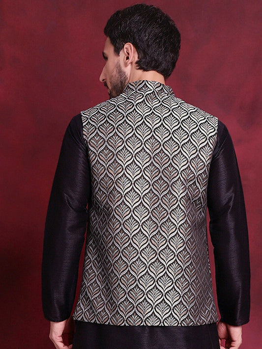Men’s Black & Silver Nehru Vest – Woven Silk Blend Ethnic Jacket