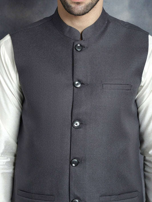 Buy Charcoal Woven Solid Nehru Jacket for Men | Mandarin Collar, Sleeveless – Indiaista