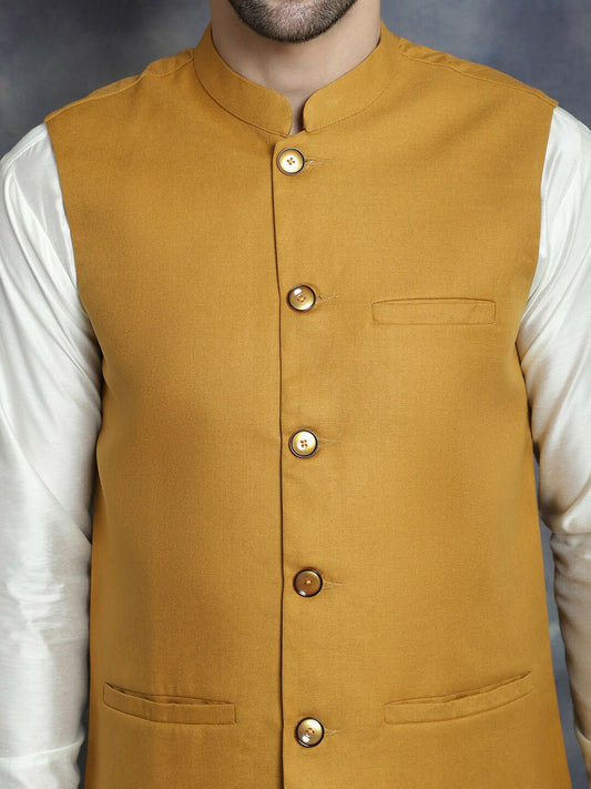 Mustard Yellow & Beige Woven Design Nehru Jacket for Men | Sleeveless with Mandarin Collar & Pockets