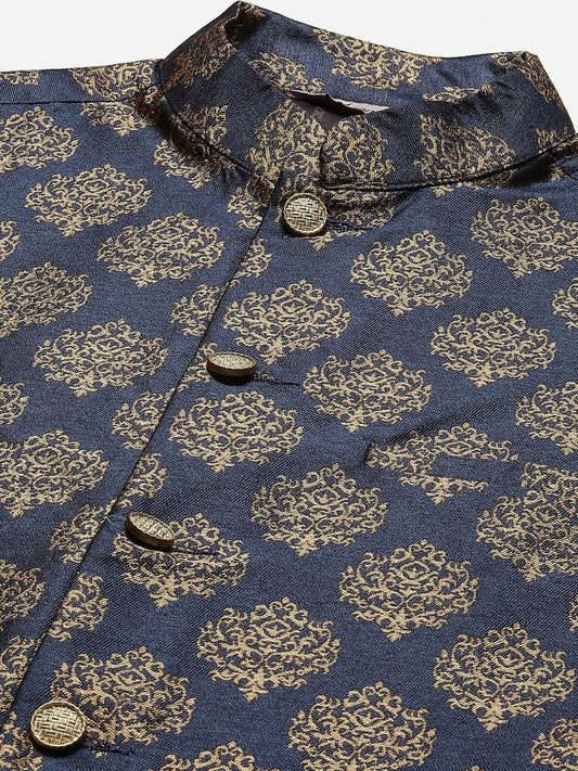 Men’s Navy Blue & Gold Printed Nehru Jacket – Elegant Festive & Wedding Wear | Indiaista