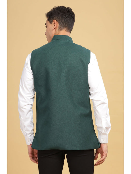 Men's Green Solid Cotton Woven Nehru Jacket with Mandarin Collar & Sleeveless Design - 3 Pockets