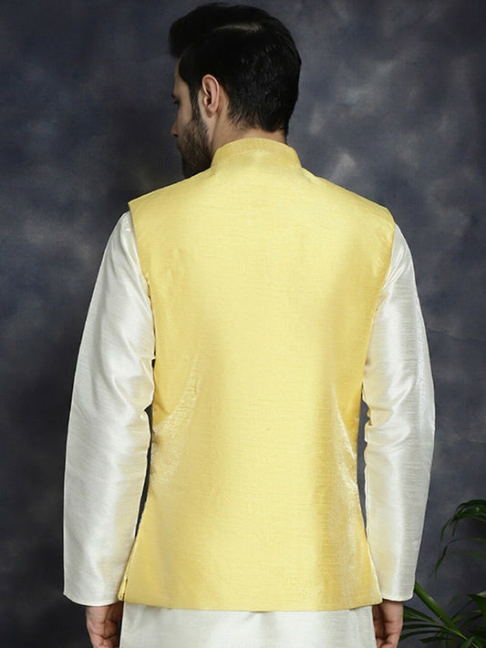 Men's Yellow Embroidered Nehru Jacket in Silk Cotton Blend