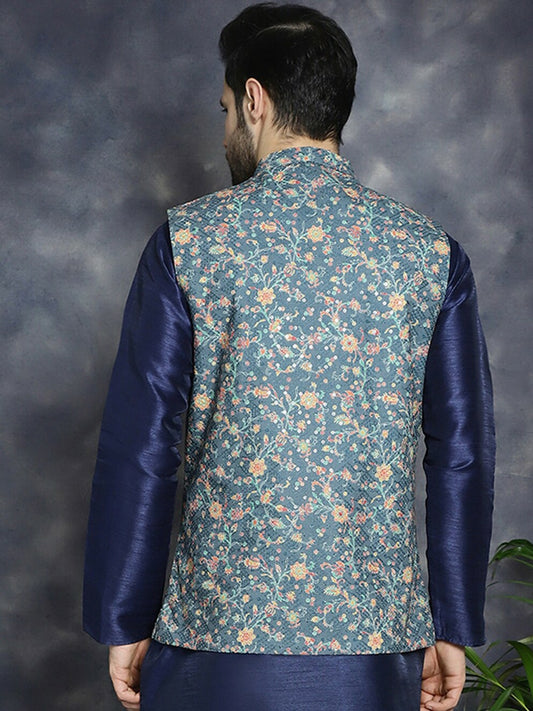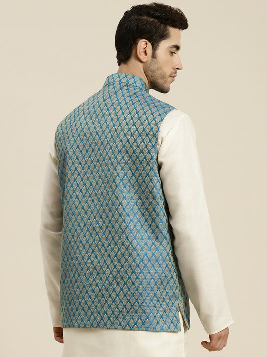 Men’s Teal Blue & Beige Woven Design Jacquard Nehru Jacket – Traditional Elegance