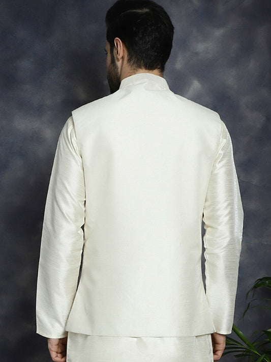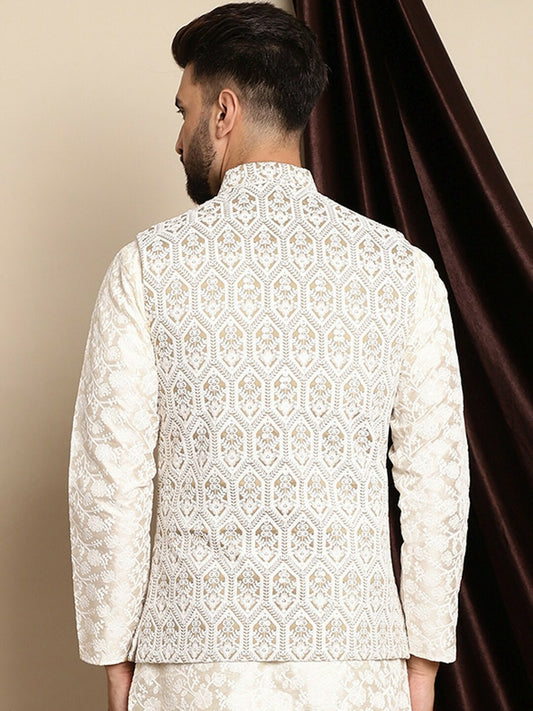 Men’s Cream Embroidered Mandarin Collar Nehru Jacket – Timeless Elegance