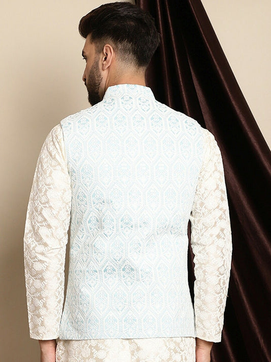 Buy Blue & White Embroidered Nehru Jacket for Men – Stylish & Elegant | Indiaista