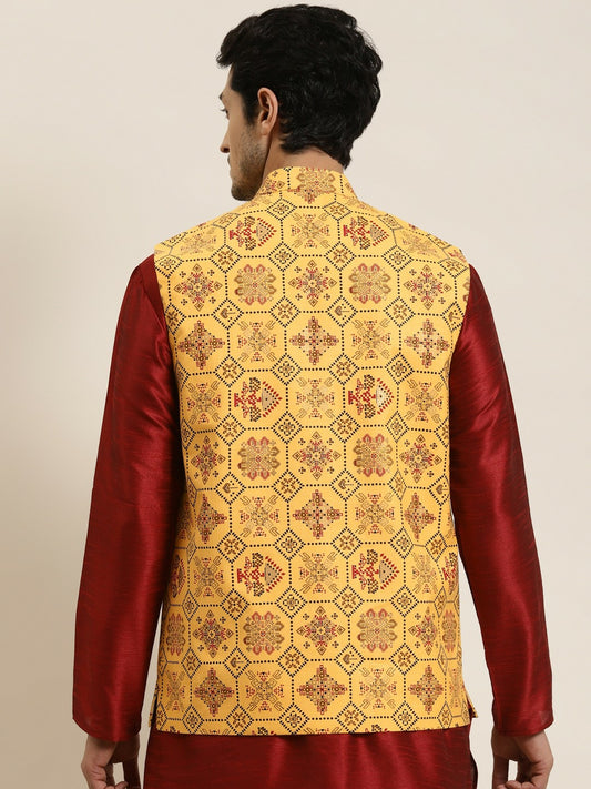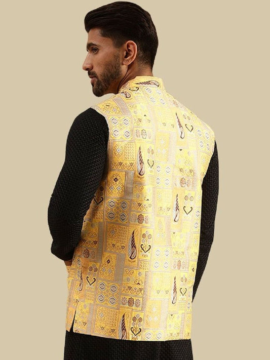 Men’s Yellow Ethnic Motifs Printed Nehru Jacket – Traditional Elegance
