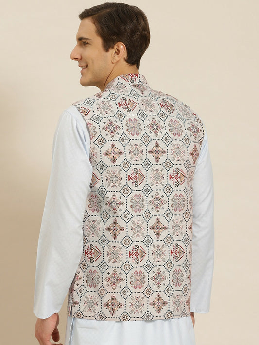 Men’s Off-White Printed Cotton Linen Nehru Jacket – Traditional Elegance
