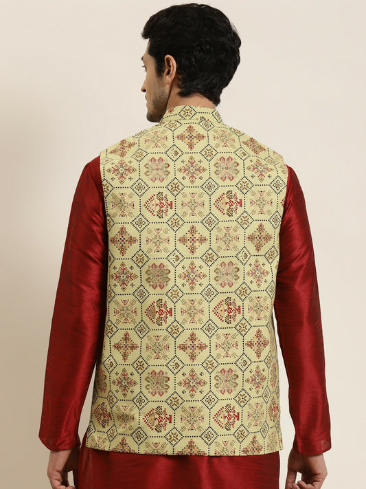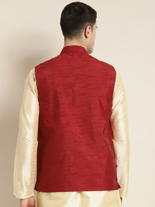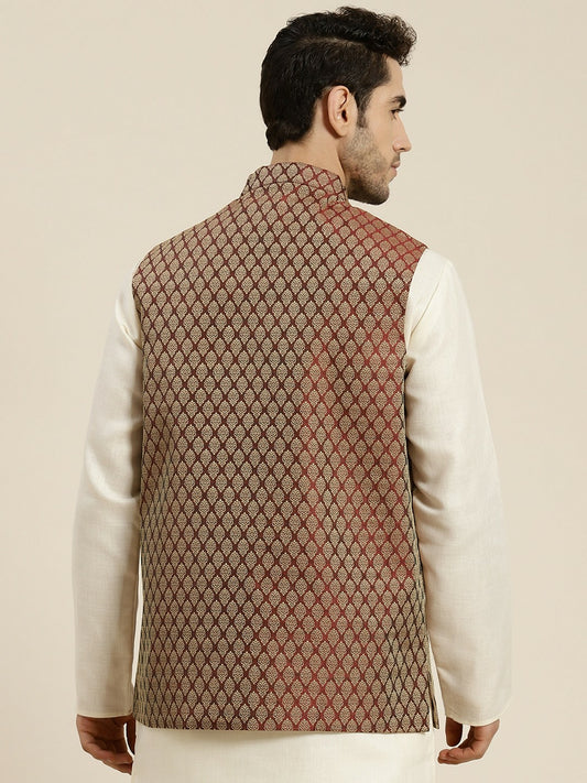 Men’s Maroon & Beige Woven Design Jacquard Silk Nehru Jacket – Traditional Elegance
