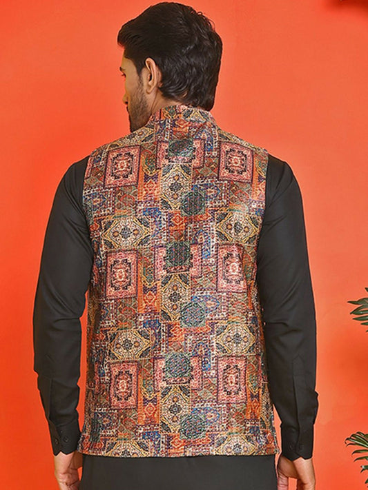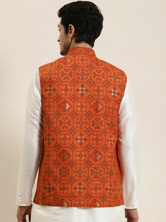 Men’s Orange Ethnic Motifs Printed Nehru Jacket – Traditional Elegance