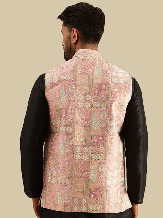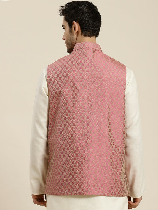 Men’s Pink & Beige Self Design Jacquard Nehru Jacket – Traditional Elegance