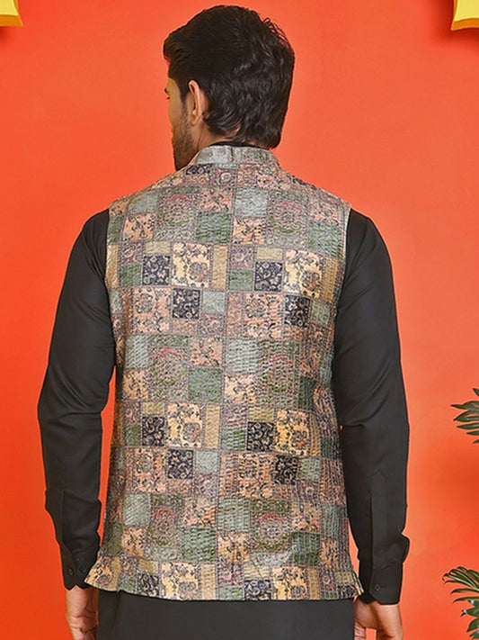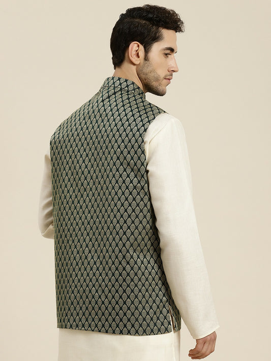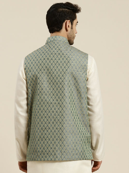 Men’s Green & Beige Woven Design Jacquard Silk Nehru Jacket – Traditional Elegance
