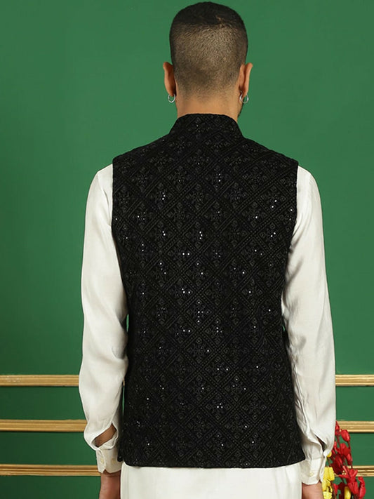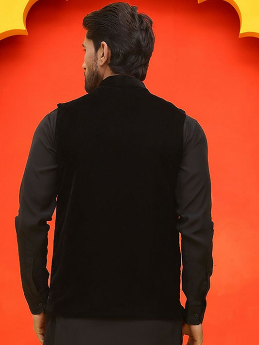 Men’s Black Embroidered Velvet Nehru Jacket – Sleeveless Ethnic Layer