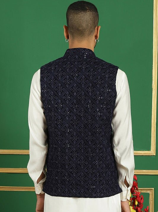 Men’s Navy Blue Embroidered Velvet Nehru Jacket – Regal Sleeveless Vest