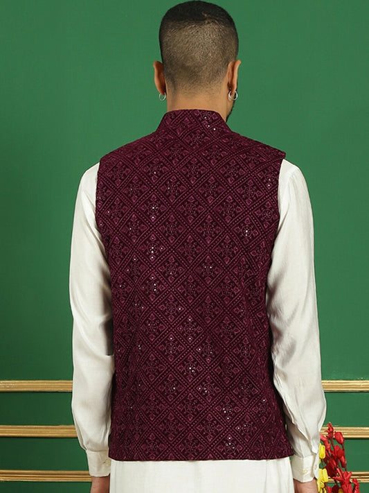 Men’s Burgundy Sequin Embroidered Nehru Jacket – Velvet Festive Vest