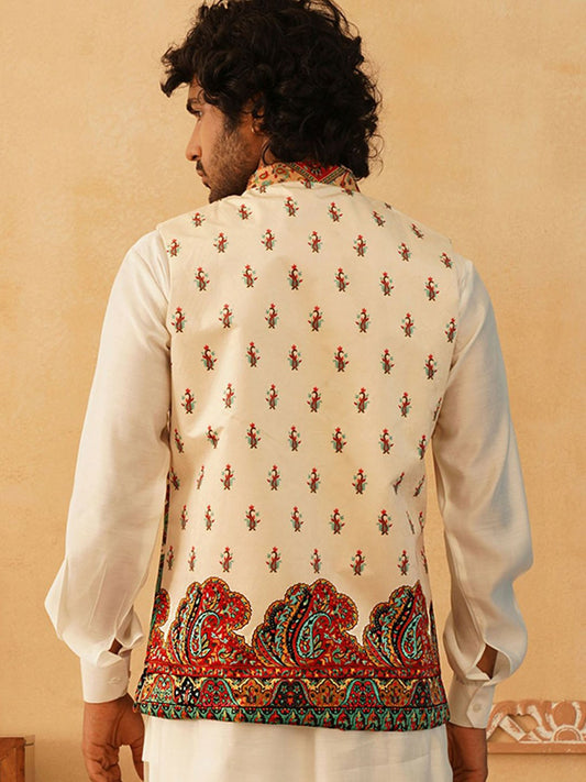 Men’s Cream Printed Velvet Nehru Jacket – Festive Sleeveless Layer