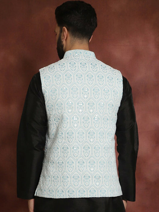Men's Blue Embroidered Nehru Jacket in Silk Cotton Blend