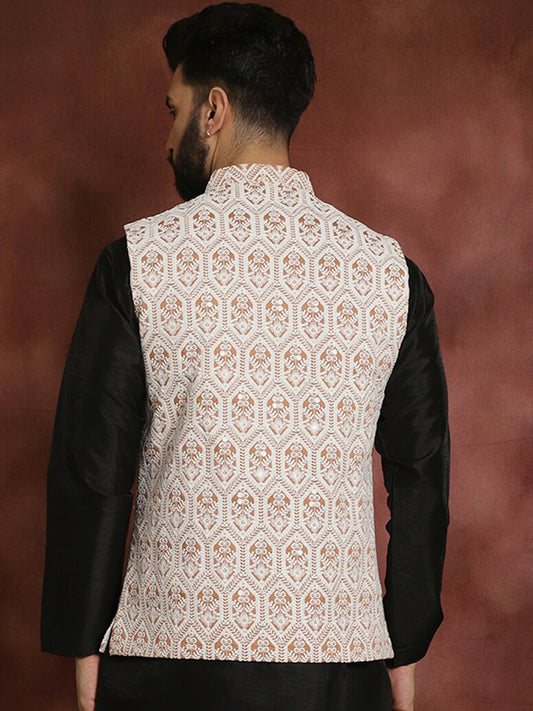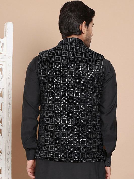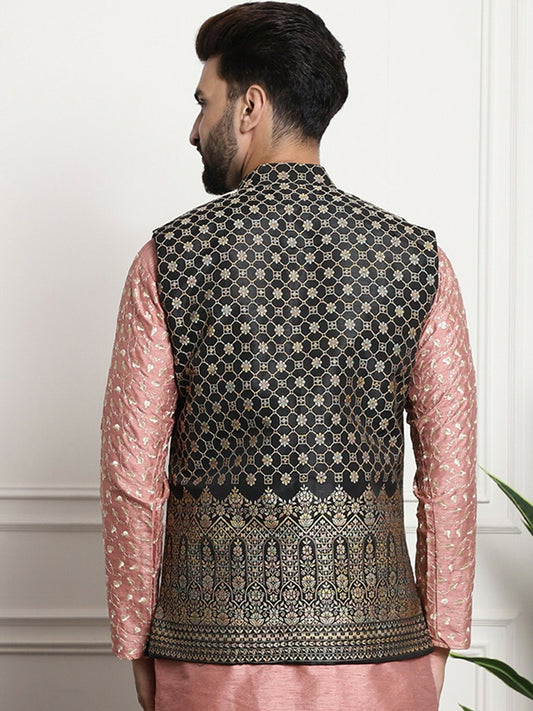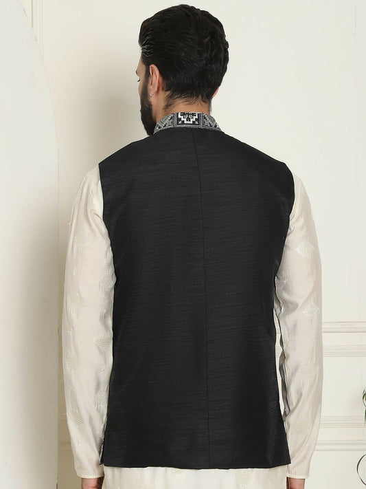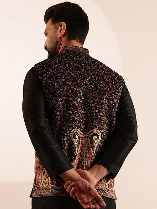 Men’s Black Embroidered Woven Nehru Jacket – Traditional Elegance