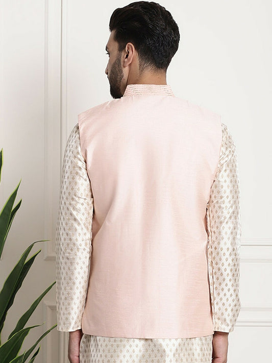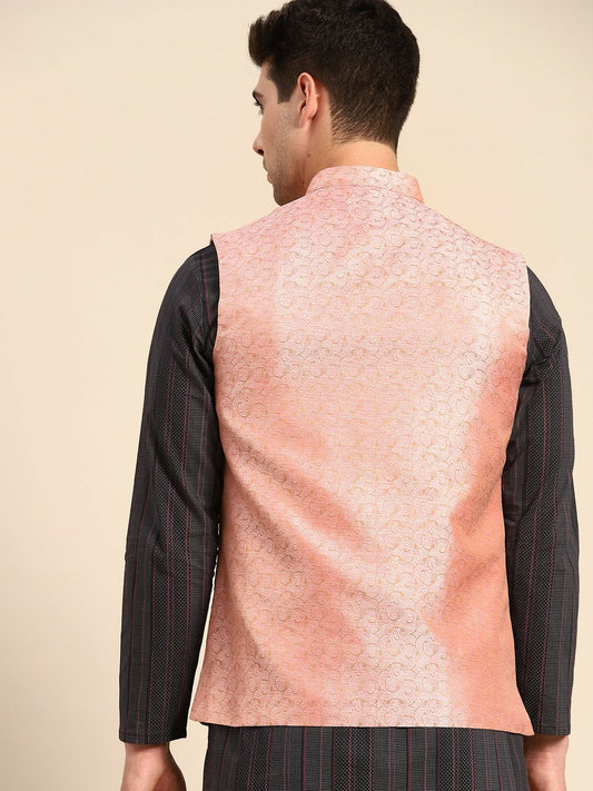 Men's Peach Embroidered Jacquard Silk Nehru Jacket