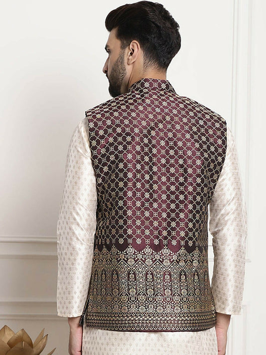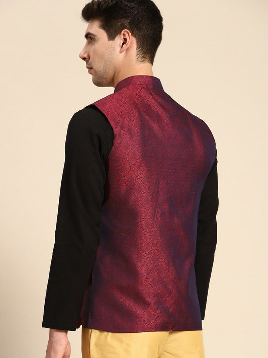 Men's Maroon & Navy Jacquard Silk Nehru Jacket with Woven Design