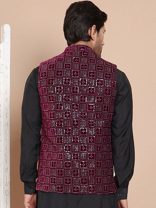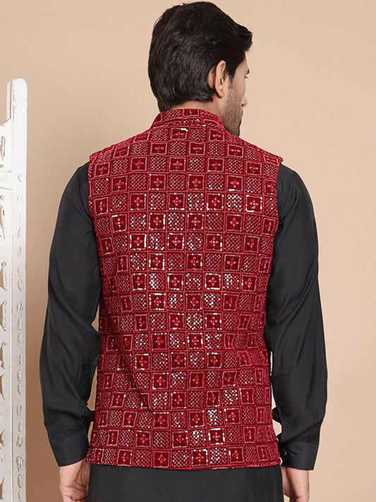 Men's Maroon Embroidered Velvet Nehru Jacket with Mandarin Collar
