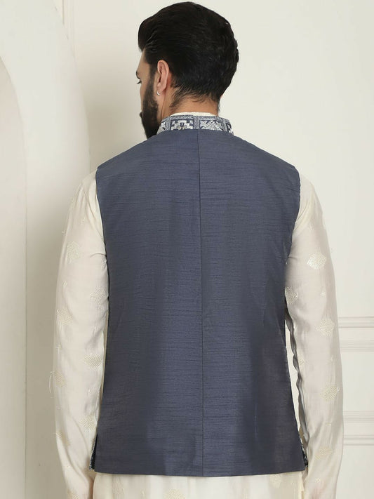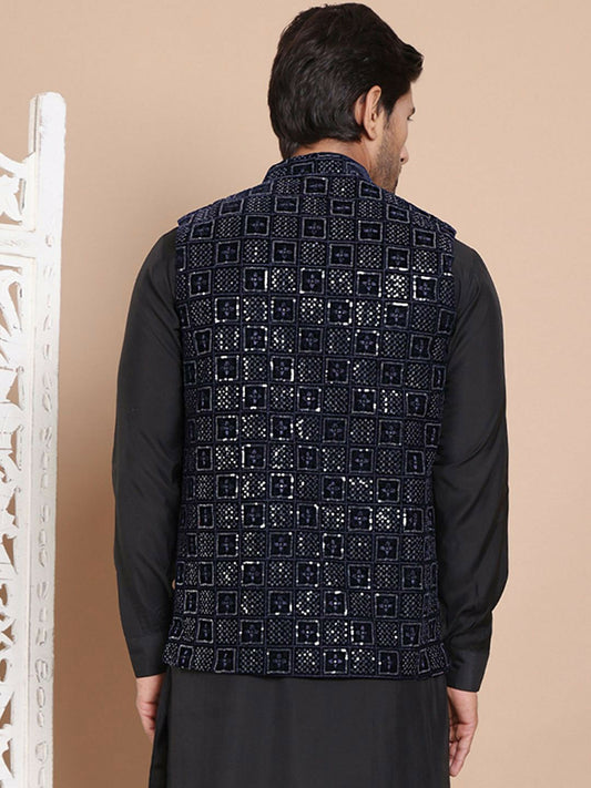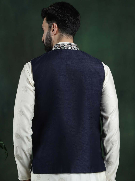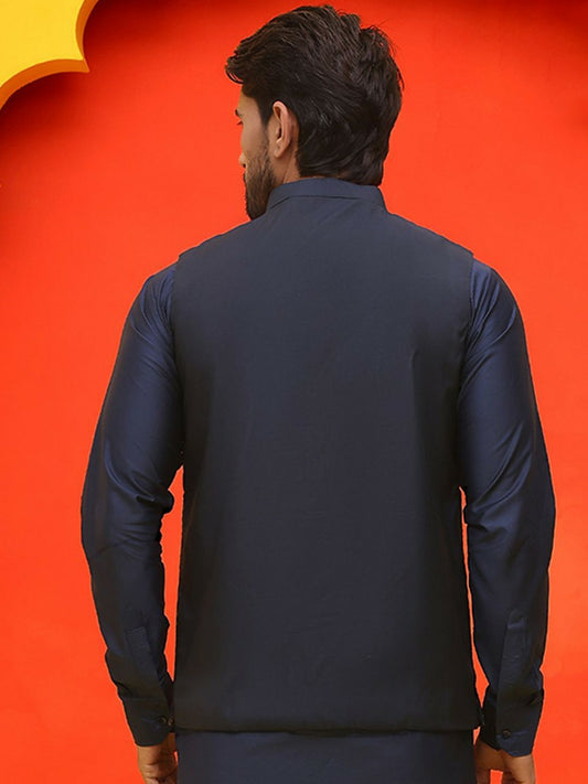Men’s Navy Blue Embroidered Nehru Vest – Silk Blend Ethnic Waistcoat