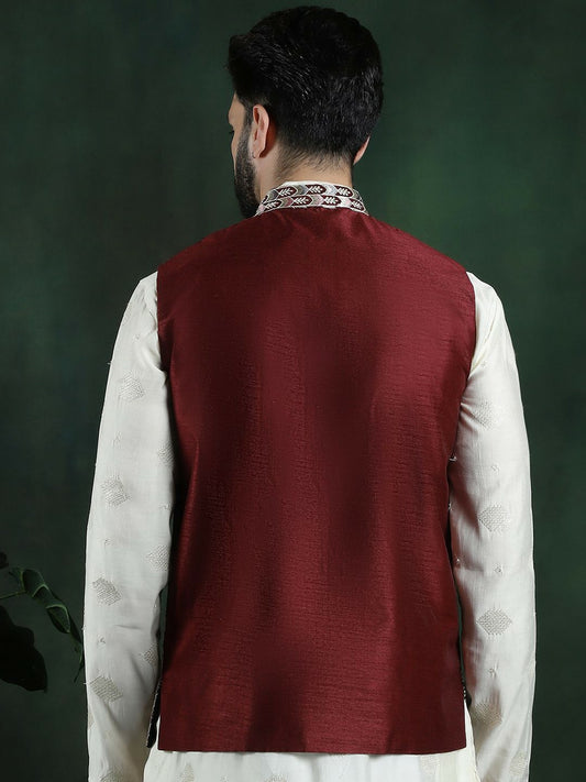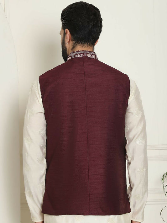 Men’s Maroon Embroidered Woven Nehru Jacket – Traditional Elegance