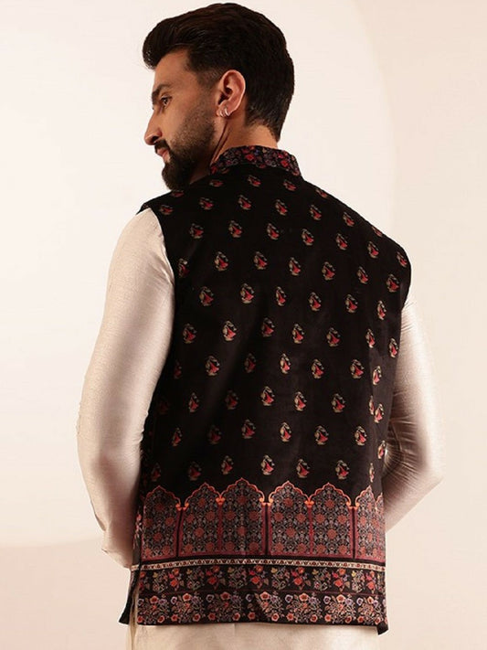 Men’s Black Velvet Printed Nehru Jacket – Festive Elegance