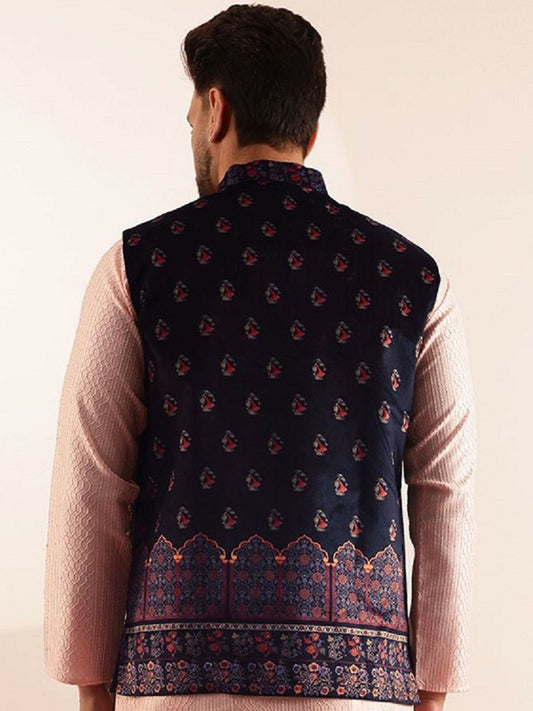 Men’s Navy Blue Paisley Printed Nehru Jacket – Traditional Elegance