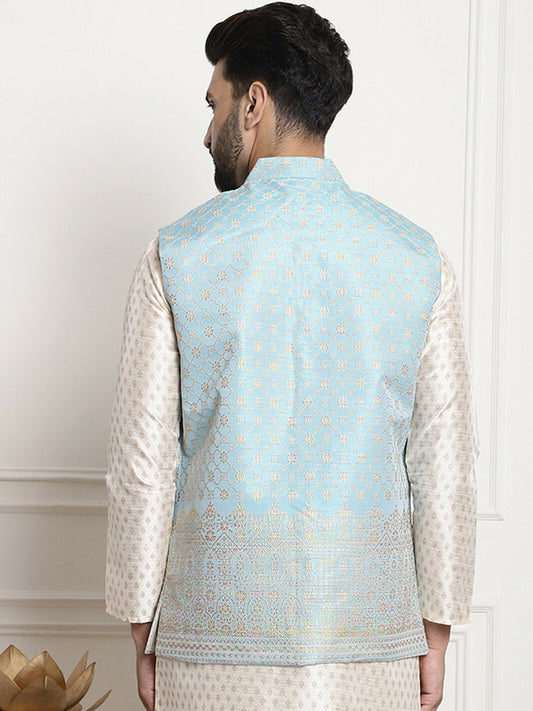 Men’s Blue & Gold Ethnic Motifs Woven Nehru Jacket – Timeless Elegance