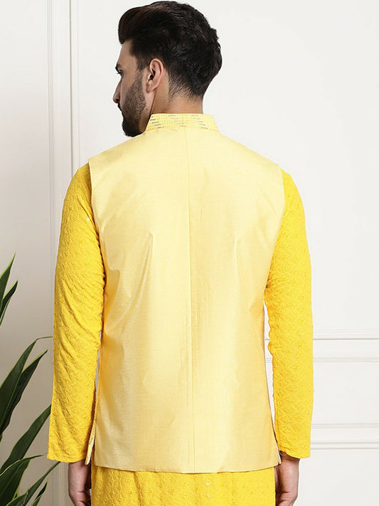Men’s Yellow Embellished Silk Nehru Jacket – Regal Festive Look