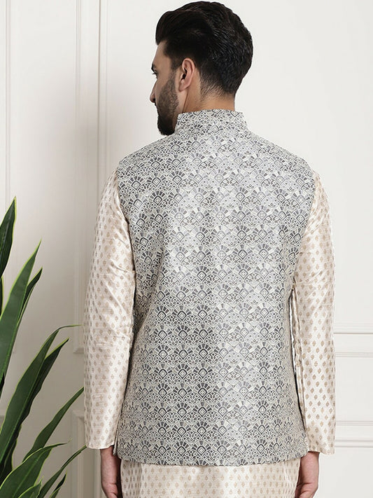 Men’s Grey Ethnic Motifs Woven Nehru Jacket – Mandarin Collar Festive Wear