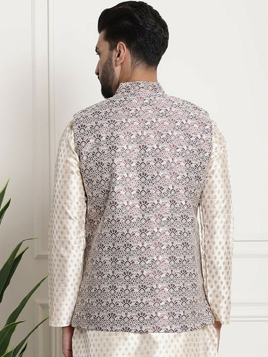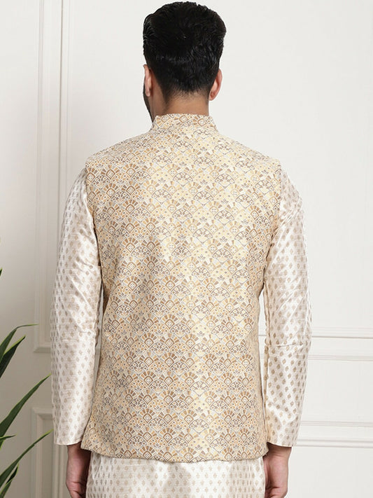 Men’s Beige & Brown Ethnic Motifs Woven Nehru Jacket – Festive Elegance
