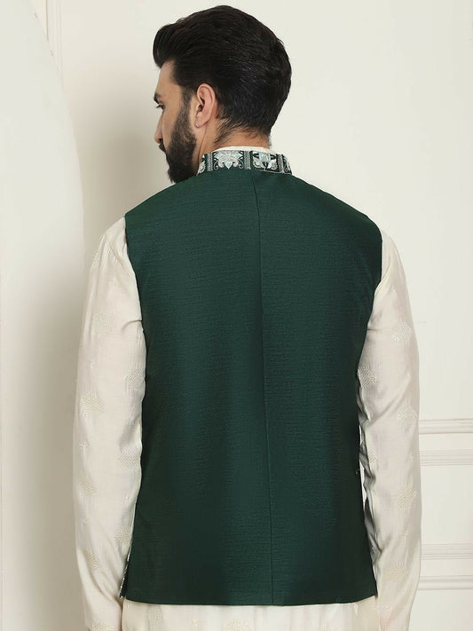 Men’s Emerald Green Ethnic Motifs Woven Nehru Jacket – Festive Classic