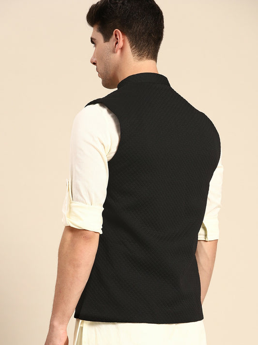 Men's Black Self-Textured Nehru Jacket in Premium Silk Blend