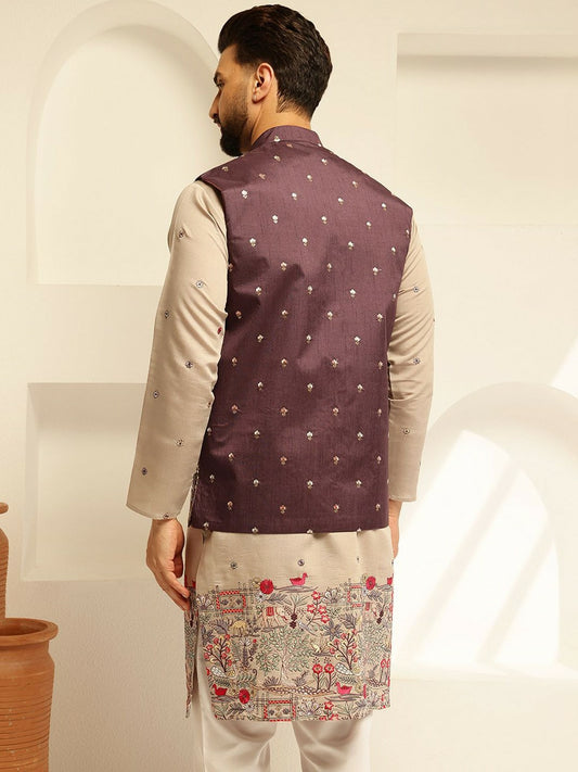 Men’s Cream Embroidered Woven Nehru Jacket – Elegant Traditional Wear