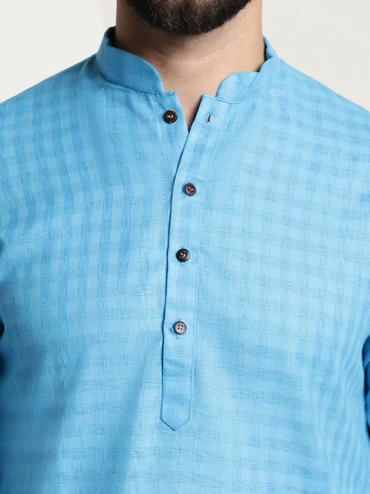 Men’s Blue Checked Dobby Cotton Kurta – Mandarin Collar, Knee Length, Regular Fit | Indiaista