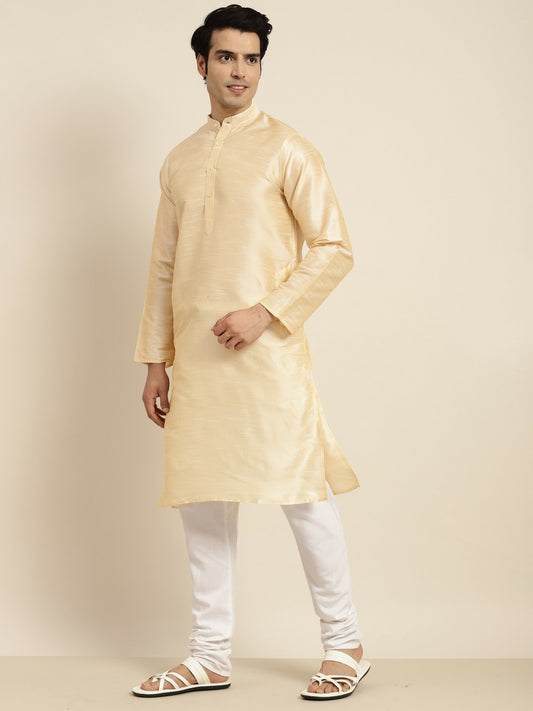 Men's Gold-Toned Band Collar Kurta – Solid Silk, Knee-Length, Regular Fit | Indiaista