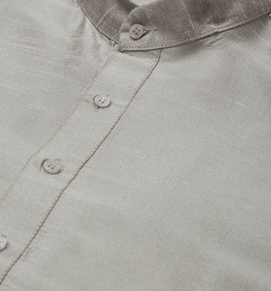 Men’s Silver-Toned Band Collar Kurta – Solid, Knee-Length, Regular Silk | Indiaista