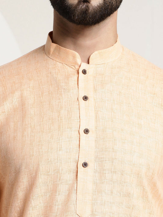 Men's Peach-Coloured Checked Dobby Cotton Kurta – Mandarin Collar, Knee-Length, Regular Fit | Indiaista