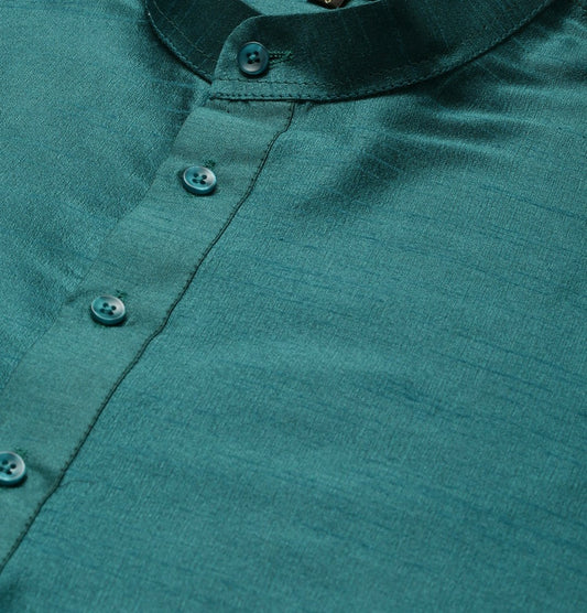 Men’s Green Solid Kurta – Mandarin Collar, Knee-Length, Regular Silk Fabric | Indiaista