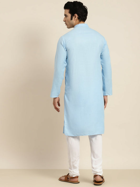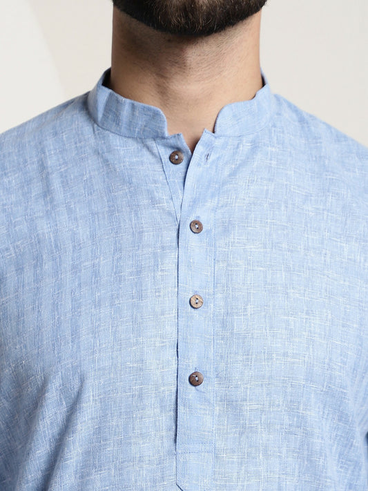 Men's Blue Solid Kurta – Mandarin Collar, Knee-Length, Regular Fit Cotton Kurta | Indiaista