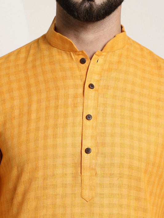 Men's Mustard Yellow Checked Dobby Kurta – Mandarin Collar, Knee-Length, Cotton for Weddings & Festivals | Indiaista