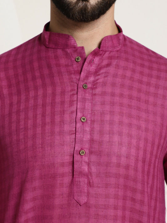 Men’s Magenta Checked Dobby Cotton Kurta – Mandarin Collar, Knee Length | Indiaista