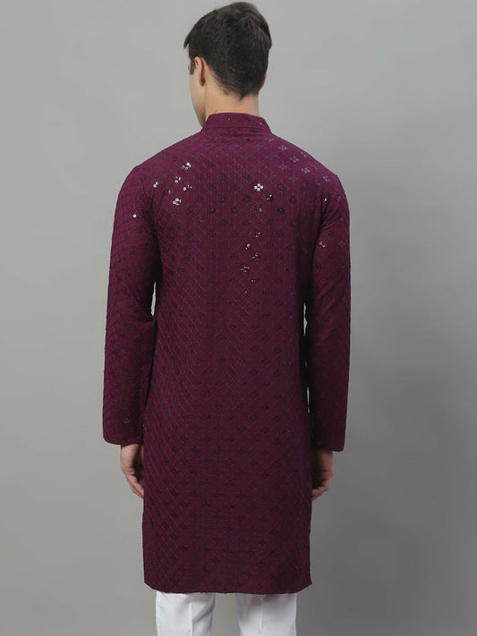 Men’s Purple Geometric Embroidered Sequinned Kurta – Cotton, Mandarin Collar