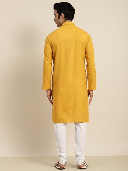 Men's Mustard Yellow Solid Kurta with Mandarin Collar – Regular Fit, Knee-Length Cotton Kurta | Indiaista