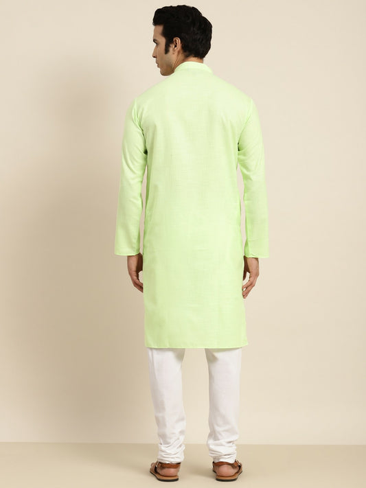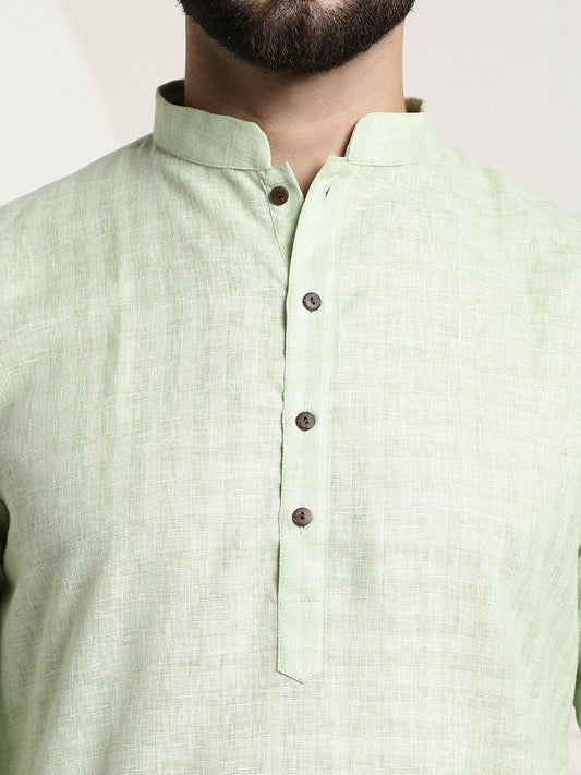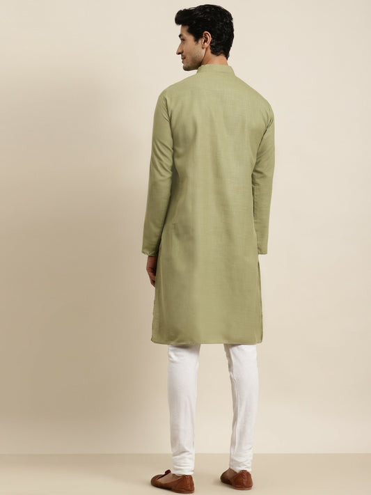 Men’s Green Solid Kurta with Mandarin Collar – Cotton Knee-Length Traditional Kurta | Indiaista